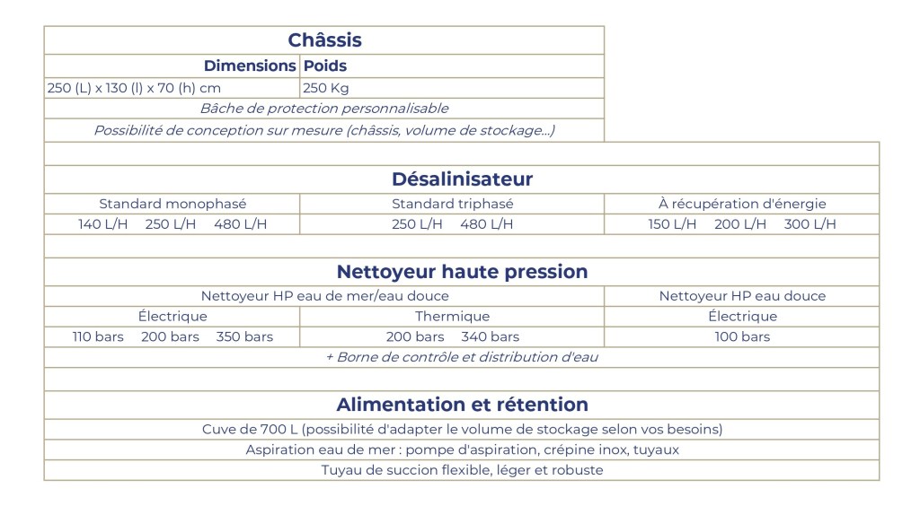 Chacun des éléments qui compose la station est personnalisable : capacité de production du dessalinisateur, nombre de bars du nettoyeur haute pression (de 110 à 350 bars), disponible en thermique ou en électrique, volume de la cuve de rétention.