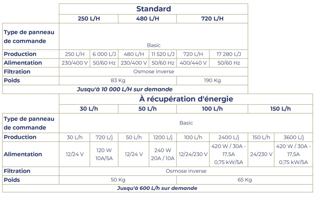 Des unités standards et mobiles, sur châssis, capables de produire 100 à 800 litres/heure. Ces unités peuvent s’adapter sur différents supports selon vos besoins. Le châssis pourra par exemple être déposé sur un chariot, une remorque, un véhicule utilitaire, un ponton flottant, ou un bateau.
